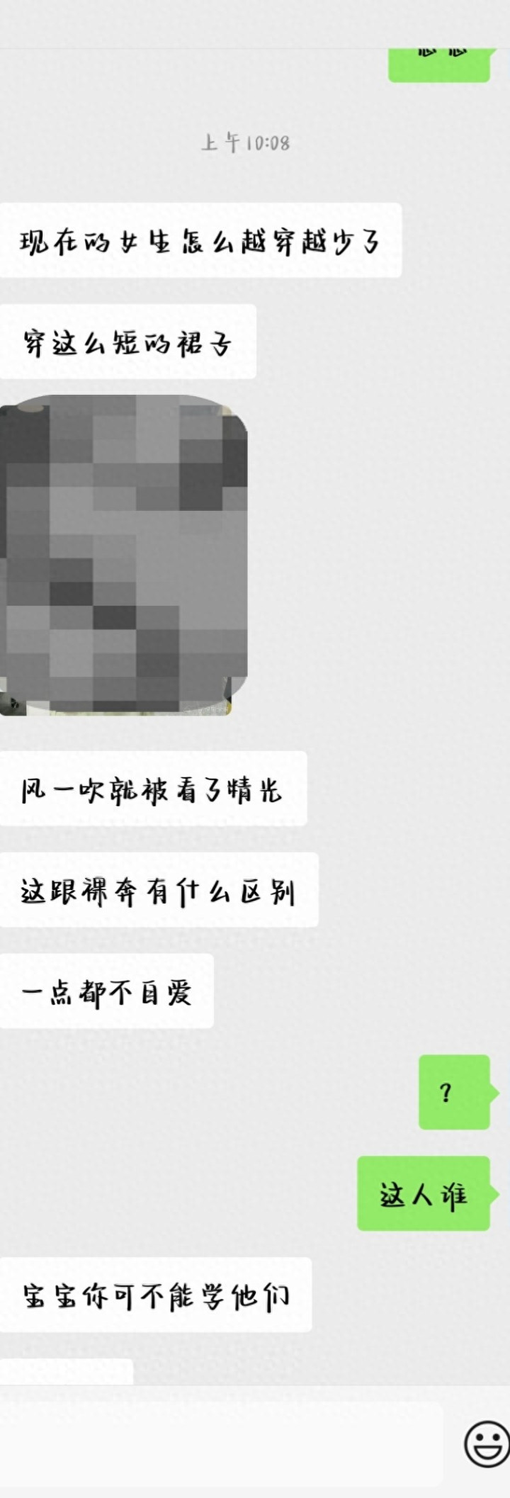4.他今天出去玩,遭遇有穿短裙的女生,他给我吐槽,要我认为很断念。